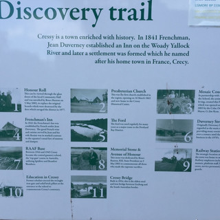 The RAAF base was news to me. The plaque explains that between 1939 and 1946 the Royal Australian Air Force operated a combat training aerodrome in Cressy, originally the #1 armament training station. Between 1942 and 1943 a general reconnaissance school was incorporated with the course including submarine searching, ship spotting and recognition. Between 1944 and 1945 Cressy became the central gunnery school, the “top gun” course in Australia, utilizing Spitfires and Beaufort Bombers.